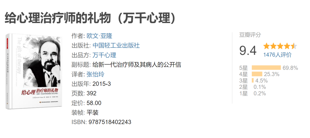 与其说它是一本书,其实它更像是世界存在主义心理治疗大师——欧文·亚隆写给年轻一代心理咨询师的信。