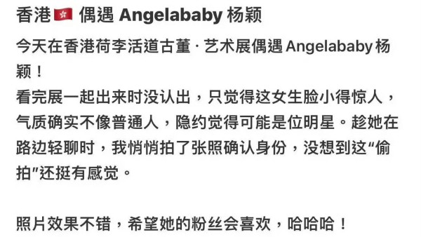搜狐娱乐讯 30日,有网友在香港偶遇了杨颖看艺术展,看完展一起出来时网友并没认出杨颖,只觉得她脸小得惊人,气质确实不像普通人,觉得可能是位明星,就趁杨颖在路边聊天时拍了张照片。