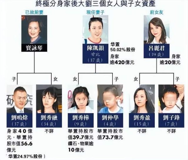 和刘銮雄分手后,吕丽君带着一双儿女独自过日子。尽管刘銮雄对吕丽君颇有怨言,但看在孩子的面子上还是给了她逾20亿港币的财产。只是,女人的嫉妒心一旦上来之后,是极其可怕的。在吕丽君眼里,大刘应该分给她更多。所以分手那几年,吕丽君和大刘的关系并不好,吕丽君甚至有意不让大刘和孩子们见面。