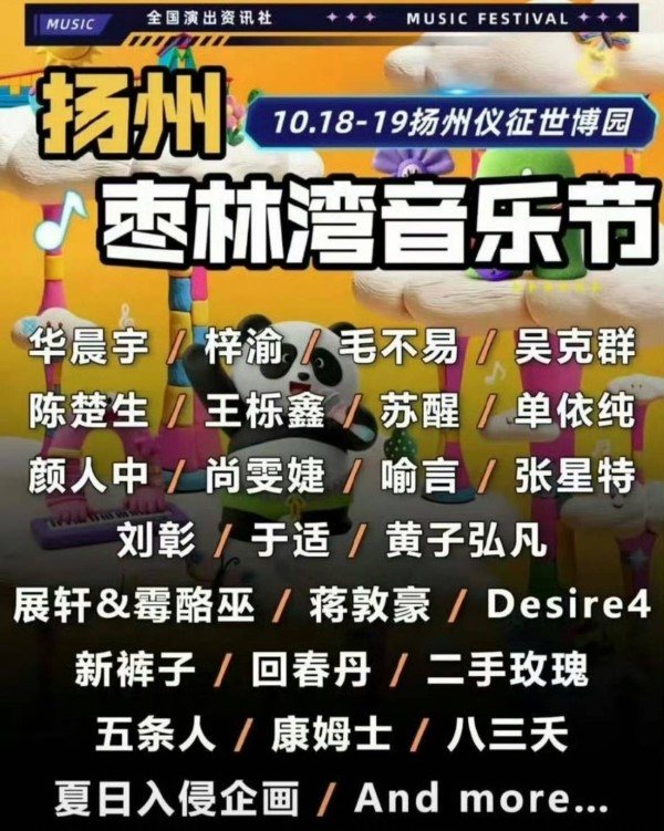 尽管遭遇这一突发状况,扬州枣林湾音乐节仍按计划于10月2日官宣了全阵容。根据官方信息,音乐节将于2025年10月18日至19日在扬州(仪征)世博园举行。10月18日的演出嘉宾包括AK刘彰、阿如那(首秀)、付辛博(首秀)、黄明昊Justin、ICE杨长青、李语庭和任素汐(首秀);10月19日则有陈楚生、大张伟、火星电台、井胧、刘端端、刘宇、ONER、苏勋伦和Yamy郭颖等。主办方表示将全力争取新的惊喜嘉宾,确保音乐节的精彩呈现。