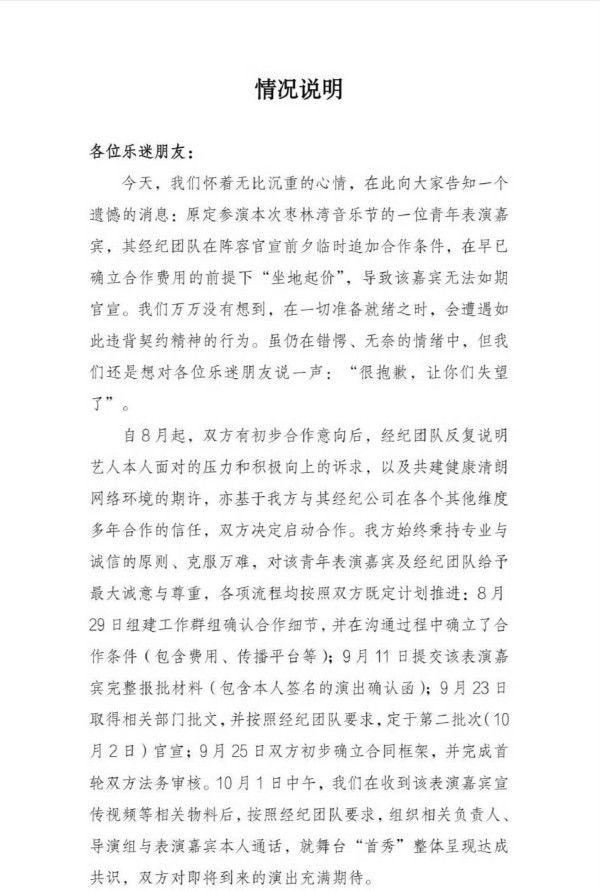 2025年10月2日,正值国庆黄金周,N次方扬州枣林湾音乐节官方发布的一纸情况说明引爆舆论。这份声明直接撕开了演艺圈合作的遮羞布,揭露一位原定参演的青年表演嘉宾团队在官宣前不到10小时突然“坐地起价”,最终导致合作破裂的全过程。