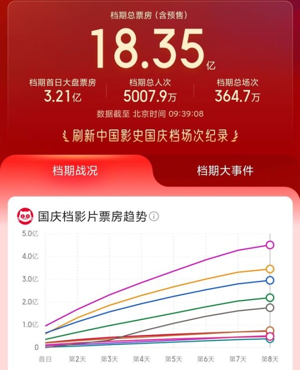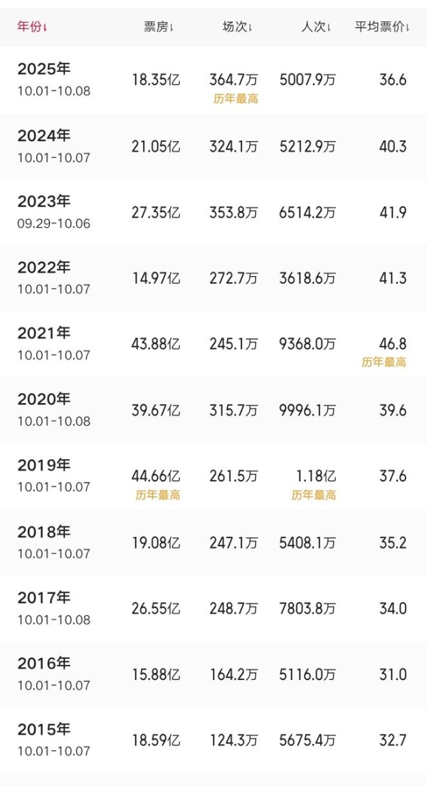2025年国庆档(10.1—10.8)以18.35亿元票房收官,档期观影人次5007.9万,场次364.7万,虽然刷新中国影史国庆档场次纪录,但票房表现为近十年(2015—2025)最差表现之一。