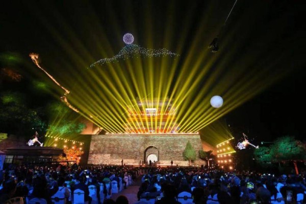 晚会以无人机灯光秀《雄关映月》拉开帷幕,夜空中的无人机编队缓缓盘旋,勾勒出居庸叠翠、明月升空等意象;城墙下方的激光投影与天空景象相呼应,形成天地合一的震撼视觉效果。