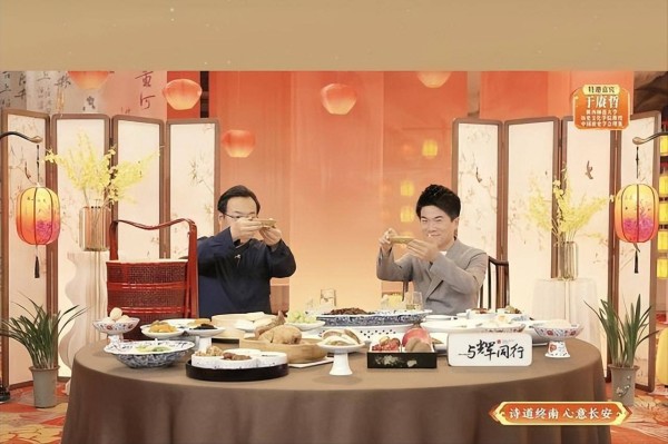 此外,这场晚会的形式也独具匠心,亲情氛围浓郁。舞台中央设有一桌丰盛的家宴,桌上摆满了具有西安地方特色的美食——肉夹馍、羊肉泡馍等。董宇辉与七位文化嘉宾围坐在一起,背景是长安的明月,他们一边品尝美食,一边谈论中秋的诗意与西安的文化。这种设置巧妙地将传统文化和中秋团圆宴完美融合,让观众仿佛与文化学者一同品味长安月色、共度团圆佳节,仿佛身临其境。