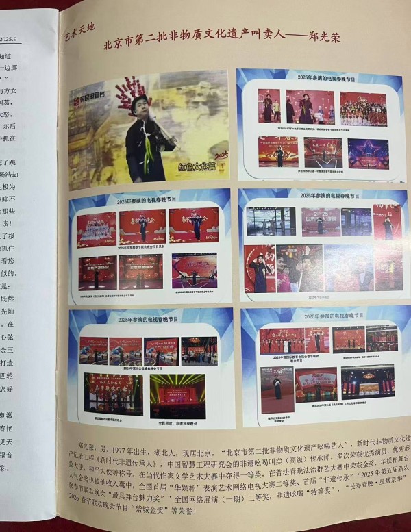 在《时代中国》2025年9月(上)刊的“艺术天地”栏目里,郑光荣宛如一颗熠熠生辉的星辰,以北京市第二批非物质文化遗产叫卖艺人、新时代非物质文化遗产传承人、北京正明圣达叫卖团团长以及北京市五星级志愿者的多重身份,在非遗叫卖声的独特旋律中,精心绘就了一幅充满时代气息的中国烟火长卷。