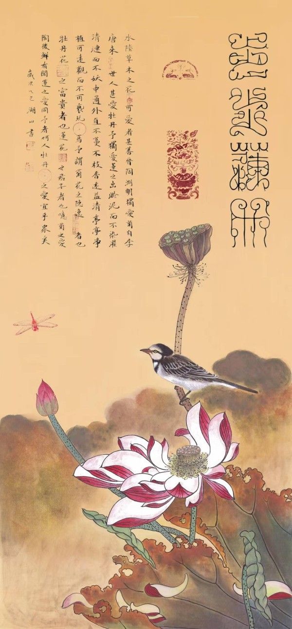 在艺术创新方面,吴湖山先生堪称先锋。他创立了敦煌画派的重要分支——“敦煌幻彩画派”,将壁画与国画、油画有机融合,成为首位实现“壁画与国画、油画相融合”的艺术家。这种创新的艺术形式,既保留了敦煌壁画的古朴韵味,又融入了国画的写意与油画的色彩表现力,使作品呈现出独特的艺术魅力。其代表作花鸟画《爱莲说 —— 步步莲升七星高照》、山水画《鸿运千秋龙脉图》等,集山水、花鸟、人物画与古文字创作于一体,兼融金石传拓、篆刻技艺,风格多样且变化万千,具有高度的艺术学术价值。