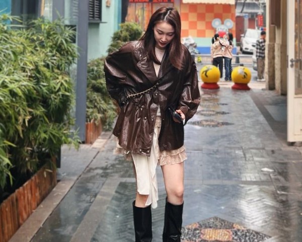 在钱天一晒出的照片上,有两张照片给人留下了深刻印象。其中一张照片上,钱天一长发披肩,穿着棕色的皮衣。外面背着一个花色的包包。下身是一条超短裙。脚上穿着黑色的靴子!看背景,钱天一是在一个小巷子里!地上贴着深色的瓷砖。周围的环境非常漂亮。旁边的墙壁是蓝色的,墙角下整整齐齐摆放了多盘绿色的植物。而在巷子的尽头,有许多游客在游玩。