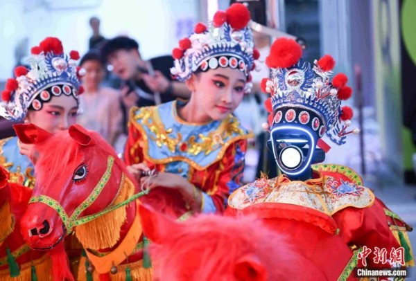 2025年6月13日,竹马小演员被“机器人演员”吸引。当日,浙江省杭州市西湖区举行“非遗正青春”文化和自然遗产日活动,多台机器狗、人形机器人参与表演。 中新社记者 王刚 摄