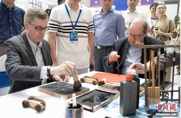 2024年9月2日,参加“中国式现代化与世界未来”明德战略对话(2024)系列活动的部分外国学者来到温州商学院体验写毛笔字、活字印刷。 中新社记者 吴君毅 摄