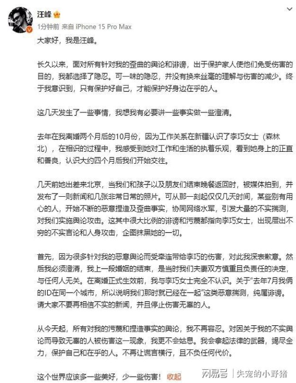 李巧作为公众人物,面对突如其来的舆论压力,选择了以公开声明的方式回应。