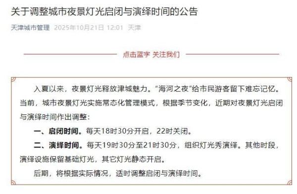 “天津城市管理”微信公众号发布公告,将调整城市夜景灯光启闭与演绎时间。