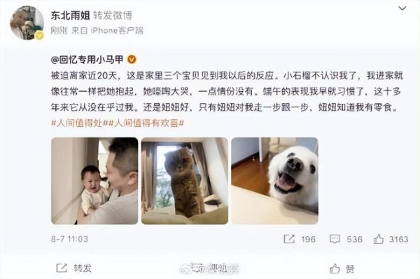 今年8月,她在微博上转发一条与宠物互动的小博文,配文“人间值得处”,好像一切都只是一个温暖的回眸。