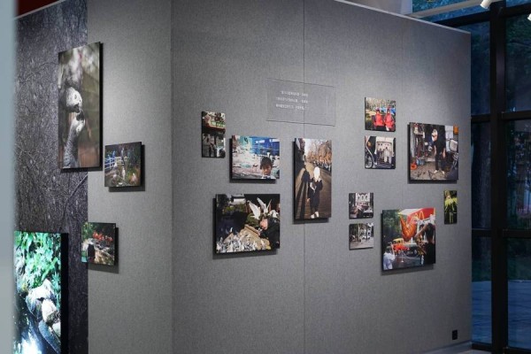 第二部分“在身边”则包含更多陆元敏所关注的海派生活中的日常细节。昏暗的公共汽车车厢里不同人的各种神态,伴随着车辆行进过程中带来的一点模糊,恰好给予照片一点动感。“这组照片好像是手机放在那儿不小心按键被碰到了拍下来的照片。”两位小姑娘在照片前窃窃私语。绘画墙前的一滩水、逼仄的居民区内部空间中的一块墙上用墨笔画的一只章鱼……这些作品清晰体现了他的创作心态:“让照片没那么有意义,不也是挺有趣的吗?”它们更像是一种视觉的随想曲,轻松、即兴,充满了对摄影本体的乐趣探索。