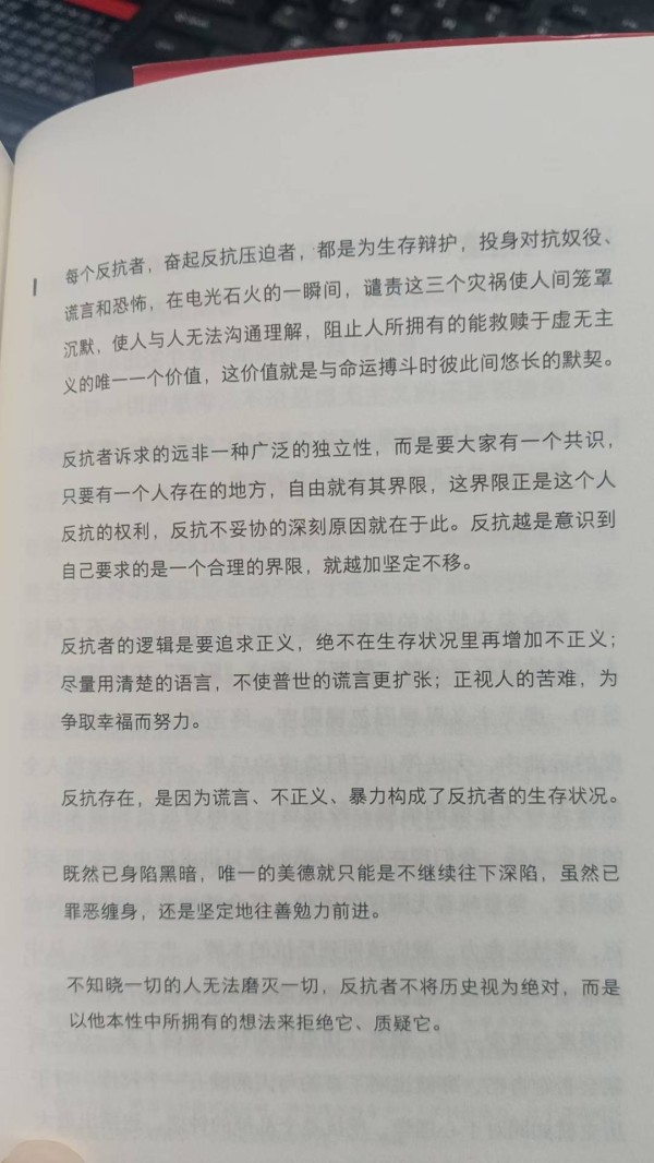 “当革命以强权与历史的名义变成杀人的疯狂机器,一种新的反抗则以节制与生命的名义成为神圣的行动,我们现在身处绝境,但在黑暗的尽头,一线我们早已预见的光明却必将出现。我们惟有通过斗争使它真正成为现实。”