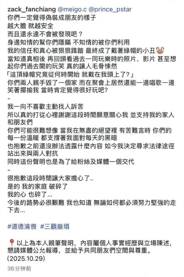 据悉,范姜彦丰在社交平台中实名爆料妻子粿粿婚内出轨歌手王子,称自己手上有明确证据,但没有公开具体细节。