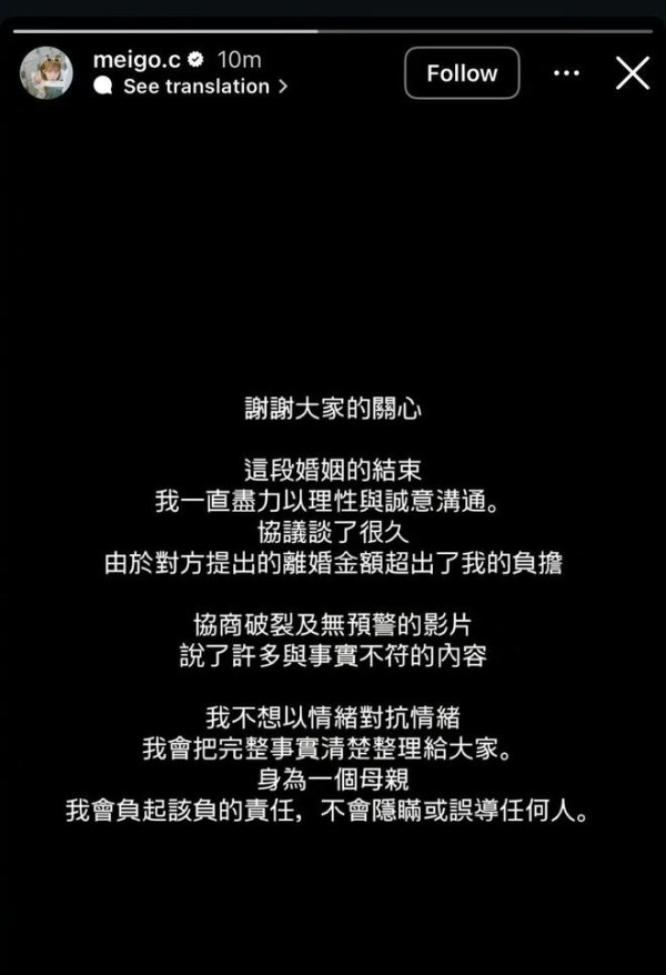 随着事件发酵,范姜彦丰的妻子粿粿率先发声回应,她表示与范姜彦丰的婚姻已经结束,自己一直在尽力以理性且有诚意的方式沟通,并且双方协商了很久,但由于范姜彦丰要的离婚金额太多,导致协商失败,身为一位母亲,粿粿会负起责任。