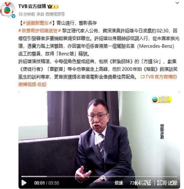 TVB官微悼念许绍雄许绍雄病逝引发观众集体缅怀 网友感叹2025成TVB黄金时代“告别之年”