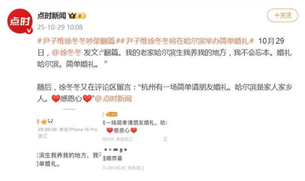 事情一度升级——10月28日,尹子维凌晨发文称“徐总不想参加我办的婚礼”,单方面宣布2026年2月26日在哈尔滨独自办婚礼,瞬间引发“婚变”猜测。不过,剧情29日就迎来反转:徐冬冬发文“翻篇”,确认婚礼最终定在哈尔滨,但补充“杭州另有一场朋友宴请”,用两地折中的方式化解矛盾。