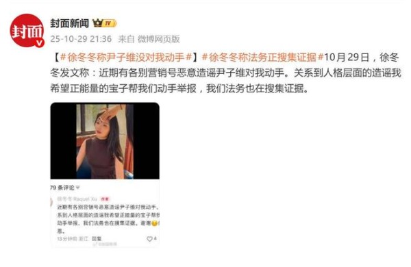据10月29日报道,演员徐冬冬在微博上正面回应“尹子维动手”的传闻,直接引爆热搜。她明确表示“近期有个别营销号恶意造谣尹子维对我动手”,并强调这类谣言已触及人格底线,不仅要求粉丝帮忙举报,还放话团队法务已着手取证,要追究造谣者的法律责任。