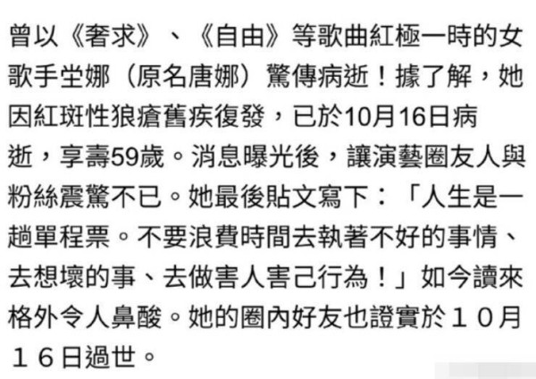歌手坣娜红斑狼疮复发去世享年59岁坣娜离世疑因红斑性狼疮旧疾复发