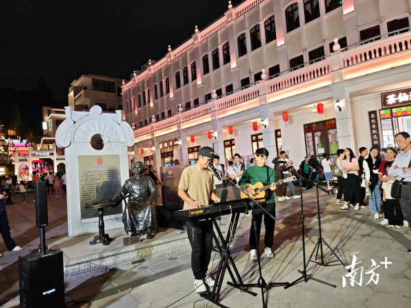 当晚,张女士带着孩子从横栏镇来到孙文西路步行街游玩,路过“香山七点半”演出现场时,忍不住停下脚步。“我在中山生活好几年了,感觉这些年文化活动越来越丰富了。今天的音乐演出也很好,可以在逛街的时候享受音乐。”她说。