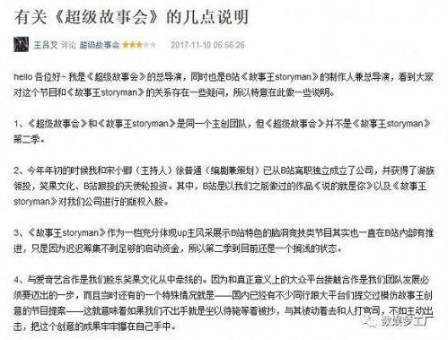 《故事王》的制作人兼总导演今年11月就曾在豆瓣上声明:“《故事王》作为一档充分体现up主风采展示B站特色的脑洞竞技类节目其实也一直在B站内部有推进,只是因为迟迟筹集不到足够的启动资金,所以第二季到目前还是一个搁浅的状态。”