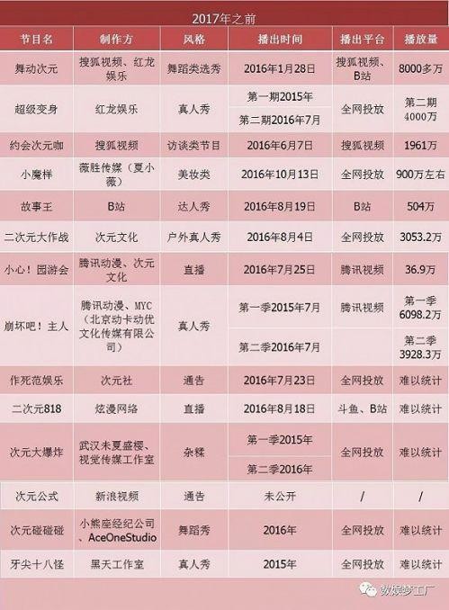 早期,原本由诸如红龙娱乐、黑天工作室、次元文化等中小型创业公司主导的自制二次元综艺,主要是将二次元文化和网综相结合。数娱梦工厂根据公开消息不完全统计,在2017年之前至少有14档二次元网综上线。