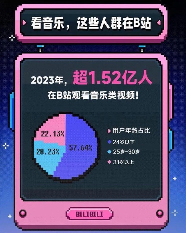 这一数字来自刚刚发布的《2023年B站音乐生态报告》。报告显示,2023年超过1.52亿人在B站观看音乐类视频,音乐类视频播放量达到573亿次,其中24岁以下人群占比达到57.64%。