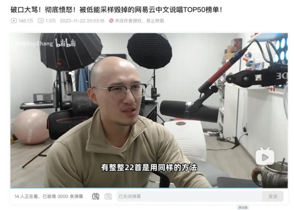 像00后UP主@阿张RayZhang,他发布的一条视频怒批“被低能采样毁掉的网易云中文说唱TOP50榜单”,指出在这50首歌里,有22首歌曲采用了同样采样手法、编排、公式的歌曲,并抛出了“中文说唱为什么一直被瞧不起,原因在这”的论点。而更大快人心的是,这支视频发酵后不久,各大音乐平台随即开始调整此类榜单的上榜规则,堪称2023年末华语音乐圈的一桩美事。