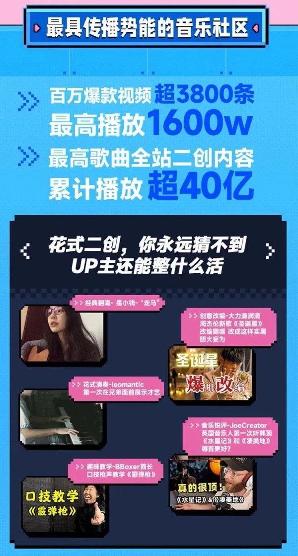 根据《2023年B站音乐生态报告》,过去一年里,音乐区超166万UP主发布超2000万音乐视频,百万爆款视频超3800条,最高播放1600万。