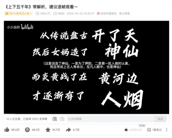 UP主@小少焱的 就用一首《上下五千年》,把从盘古开天辟地起的重要历史事件和人物,浓缩进了4分49秒的歌曲里,文字版MV还有歌词典故的详细注释。这条视频播放量高达1047.1万,历史专业的网友听了都表示“起了一身鸡皮疙瘩”。