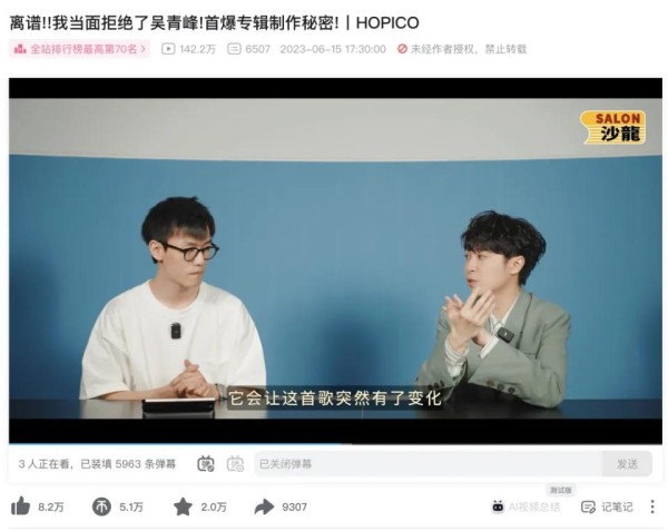 2023年,包括陶喆、吴青峰在内的一批音乐大咖,都在新歌宣发的关键节点,选择了和B站音乐区头部UP主@HOPICO 做独家对谈。