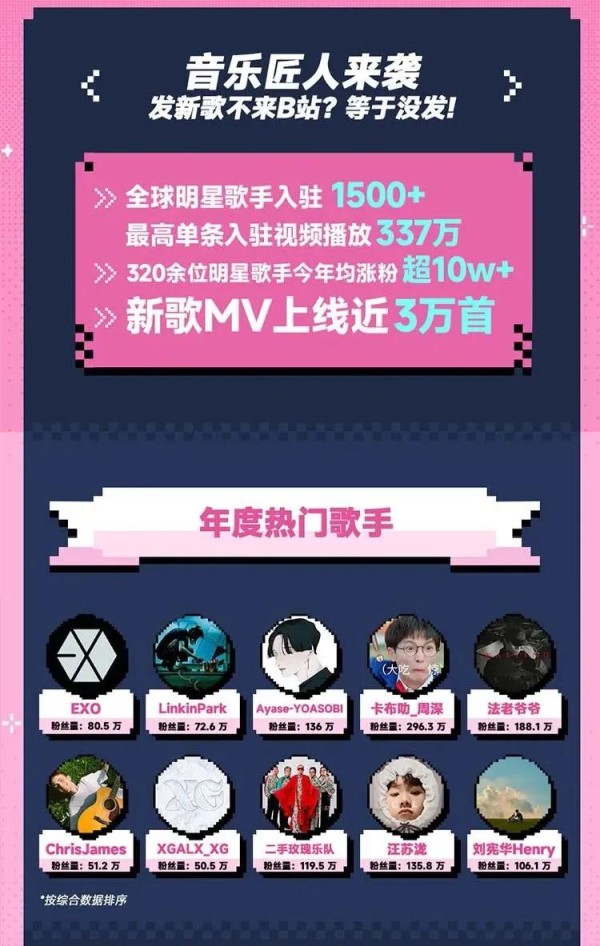 根据《2023年B站音乐生态报告》,一年内有超1500名全球明星歌手入驻B站,320余位明星歌手一年涨粉超过10W,新歌MV上线近3W首。