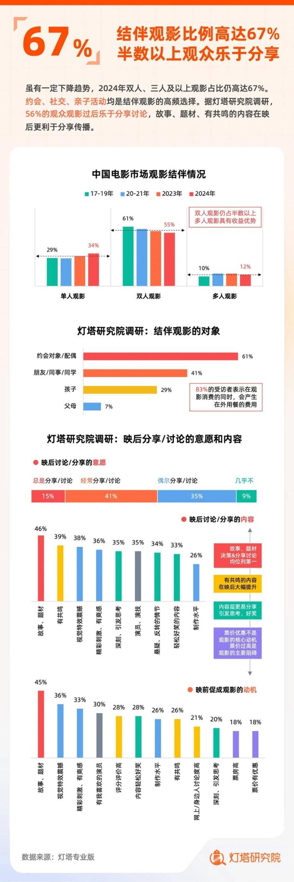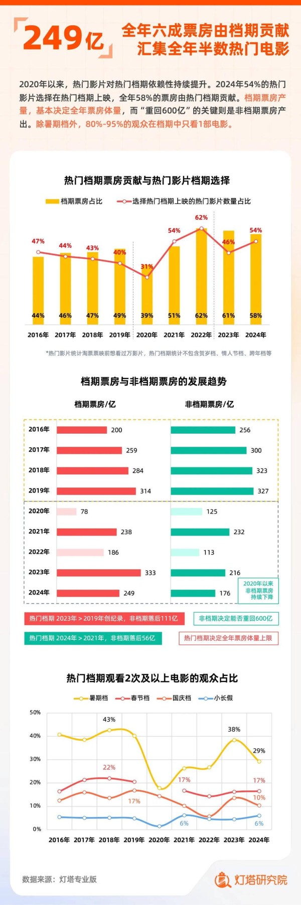 盘点数据显示,2024年中国电影市场观众总基数4.3亿,大盘向稳,2024年一年只看1次电影的观众升至57%,女性观众比例58%,结伴观影比例高达67%,半数以上观众乐于分享,各地域观众基础雄厚,39部影片单线市场破亿,84%的“新观众”因热门档期上映的电影而来,市场拉新强依赖于热门档期。培养观众在平日走进电影院的习惯,提升观影黏性,是电影市场“重回600亿”的关键。 等等。