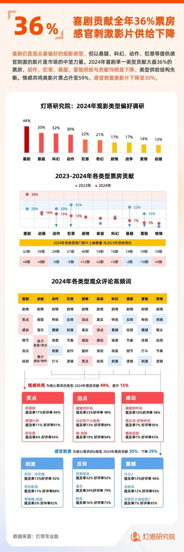 2024年喜剧票房高,可见对于观众来说,喜剧仍是最偏好的观影类型,其他如动作、犯罪、悬疑、冒险等提供感官刺激的影片,在供给与票房贡献上均明显下降,类型供给结构失衡。另外,三四线票房占比达40%,下沉进程持续推进。2024年中,25-29岁观众占比保持27%相对稳定,但25岁以下年轻观众下降至21%。过去一年中,10部电影先后45天拉动大盘,悬疑惊悚类型、青年影人主演作品、热门IP改编、青少动画乃至亲子动画是培养市场年轻化的有效品类。