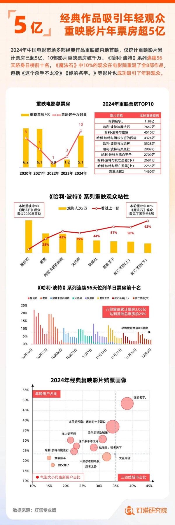 2024年中国电影市场多部经典作品重映或内地首映,据统计,重映影片累计票房已超5亿,《哈利·波特》系列连续56天跻身日榜前十名,包括《这个杀手不太冷》《你的名字。》等影片也成功吸引了年轻观众。