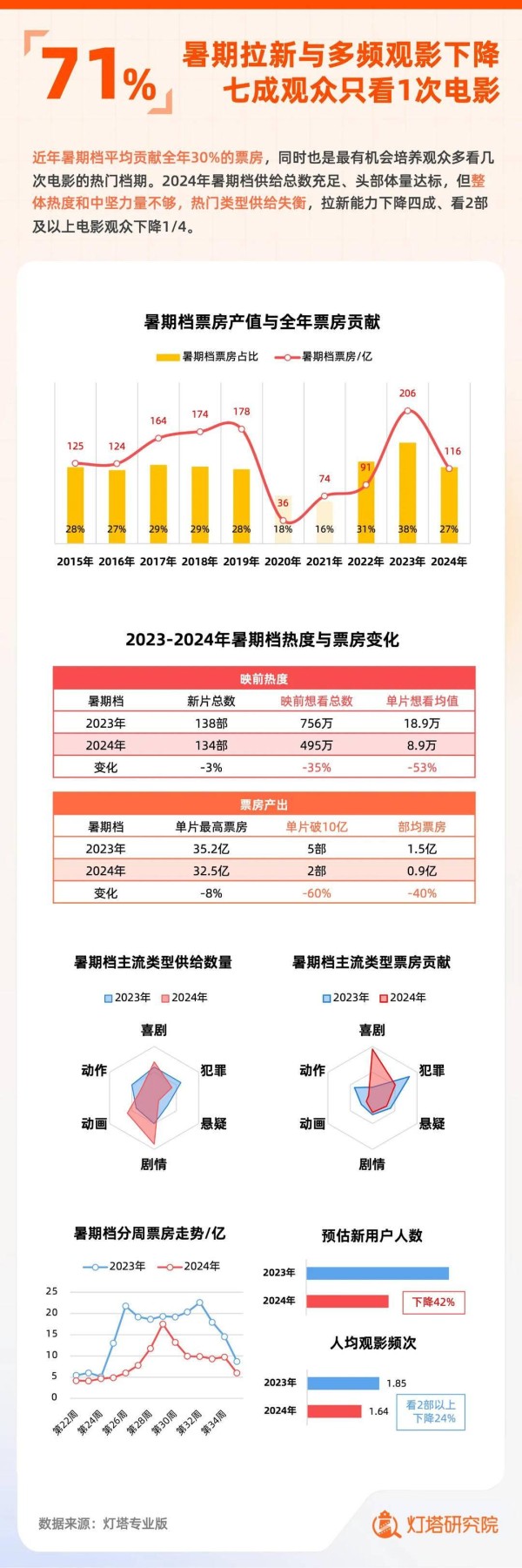 档期方面,2024年开年四大档期连创历史最佳战绩,但端午档及后续档期表现不够亮眼,档期热度是核心原因。据悉,2024年54%的热门影片选择在热门档期上映,全年58%的票房由热门档期贡献。暑期档期间,电影供给总数充足、头部体量达标,但整体热度和中坚力量不够,拉新能力下降四成。