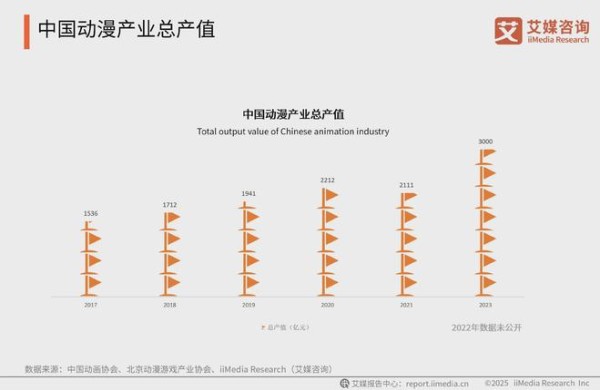 中国动漫产业总产值整体呈上升趋势。据中国动画协会数据显示,2023年中国动漫产业总产值达3000亿元,较2021年有大幅度提升。艾媒咨询分析师认为,我国动漫产业发展迅速,市场规模稳步扩张。