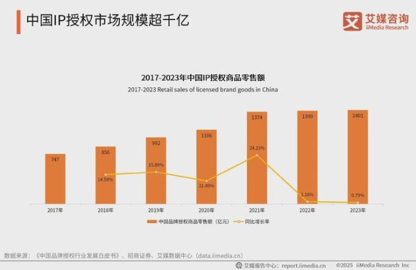 数据显示,2019-2023年中国IP授权商品零售额整体呈现上升趋势,其中2023年中国IP授权商品零售额达1401亿元,较2022年提高了11亿元。艾媒咨询分析师认为,随着中国IP的爆发,以及消费者需求的增加,授权商不断布局IP产品的开发,并通过授权改编、授权联动等方式进一步变现。