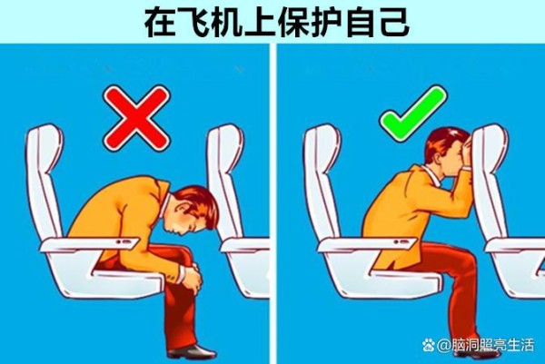 在飞机上如果发生一些紧急情况,我们一定要学会好保护自己,比如,遇到紧急迫降的时候,要选择正确的姿势,即头朝下,双臂放在膝盖上,头部不能前倾顶住前面的椅背,因为巨大的冲击力,很有可能会造成颈椎的伤害,最好将额头压在双手上,这样做能保护颈部、背部和头部,不容易受伤。