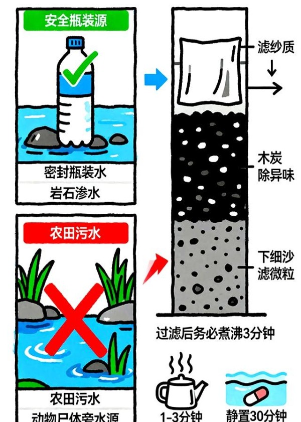 但是有几个地方的水千万不能碰:农田下游的水,里面可能有农药化肥;周围有动物尸体的地方,水里肯定全是细菌,喝了等于喝毒药。