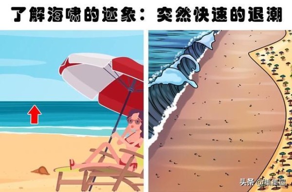 海啸通常在人们毫无准备的情况下到来,因此,你需要了解清楚海啸到来之时会有什么迹象。你要注意的是,当水从海滩暴露后,迅速且意外的往后缩,也就是以不可思议的速度快速退潮的时候,那就表明海啸即将来临。在这种情况下, 你应当警告周围的所有人,并尽快逃离现场。