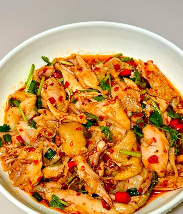 接着,戴上手套,顺着鸡腿的纹路细心撕扯,形成细条或粗条均可,但要注意不要撕得太工整。然后,根据个人口味准备辣椒油,并现炒现碾花椒,以保留其麻味。将滚烫的油“哒哒”撒在鸡丝上,瞬间散发出诱人的香味。