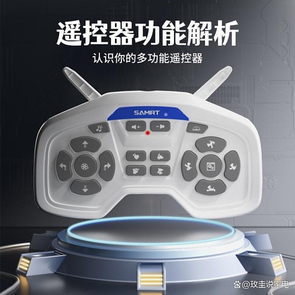 遥控操作简单直观,即使是刚开始接触电子设备的小朋友也能快速上手。遥控器配备方向控制键、音乐播放按钮和音量调节功能,顶部还设有增强信号接收的天线设计,确保无线连接稳定不掉线。每一个按键布局合理,手感清晰,避免误触,提升了整体操控体验。