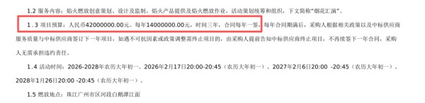 与此同时,官方采购网站在近日也同步挂出了“白鹅潭春节烟花汇演活动(2026—2028年)”项目更正公告: