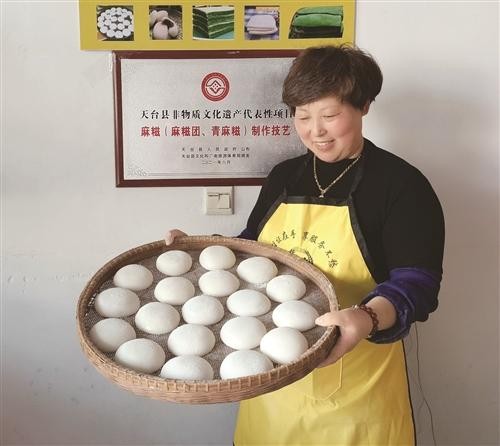 她介绍,天台麻糍历史悠久,早年只有富人才吃得起。后来,人们生活条件好了,逢年过节或家有喜事等,家家户户都会吃麻糍团。还有很多人家,会把麻糍团作为礼物送给上门的客人。天台民间还流传着一种风俗,牛生日时,农人会用麻糍来慰劳它。