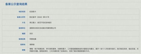 12月13日,国家电影局发布“关于2024年11月上全国电影剧本(梗概)备案、立项公示的通知”,通知显示《再见爱人》综艺节目纪录电影已经备案。