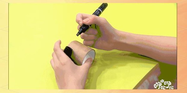 首先,在卷筒纸芯上用彩笔画出小狗的眼睛、鼻子和嘴巴的轮廓。