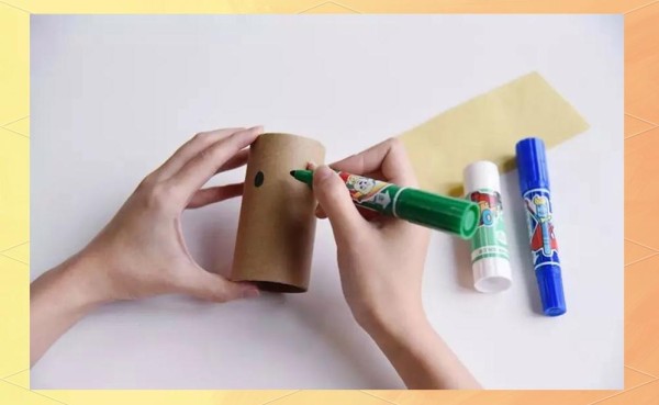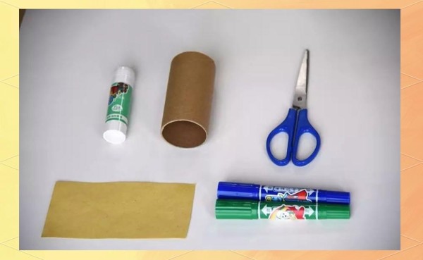 所需材料:卷筒纸芯、牛皮纸、剪刀、彩笔以及胶棒。
