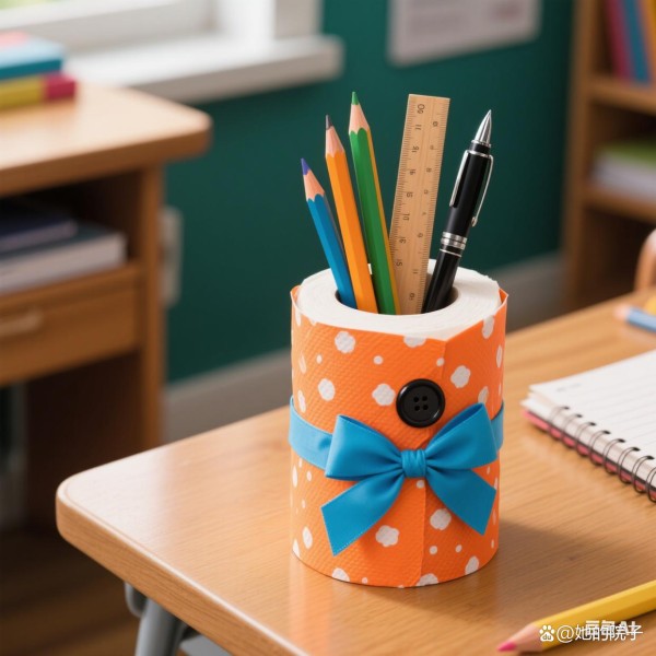 卫生纸筒+彩色包装纸=独一无二的文具管家!引导孩子测量纸筒周长裁剪包装纸,用纽扣、丝带装饰时,可以讨论垃圾分类的重要性。完成后的笔筒既是收纳好帮手,更是环保理念的实体教材。